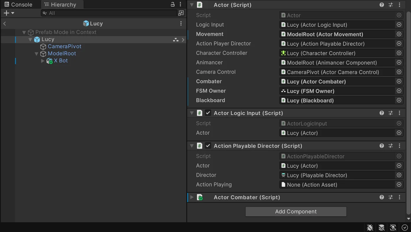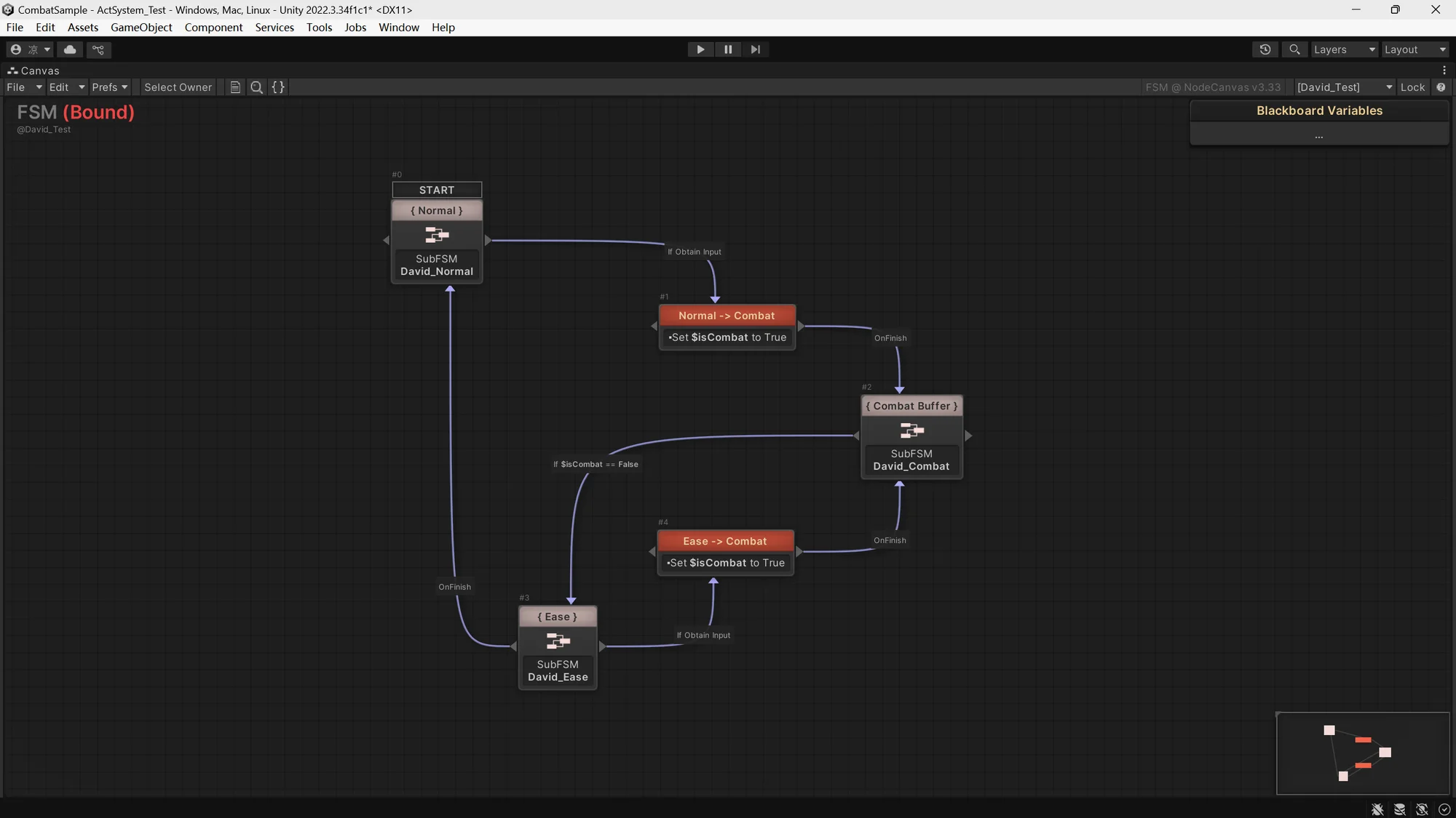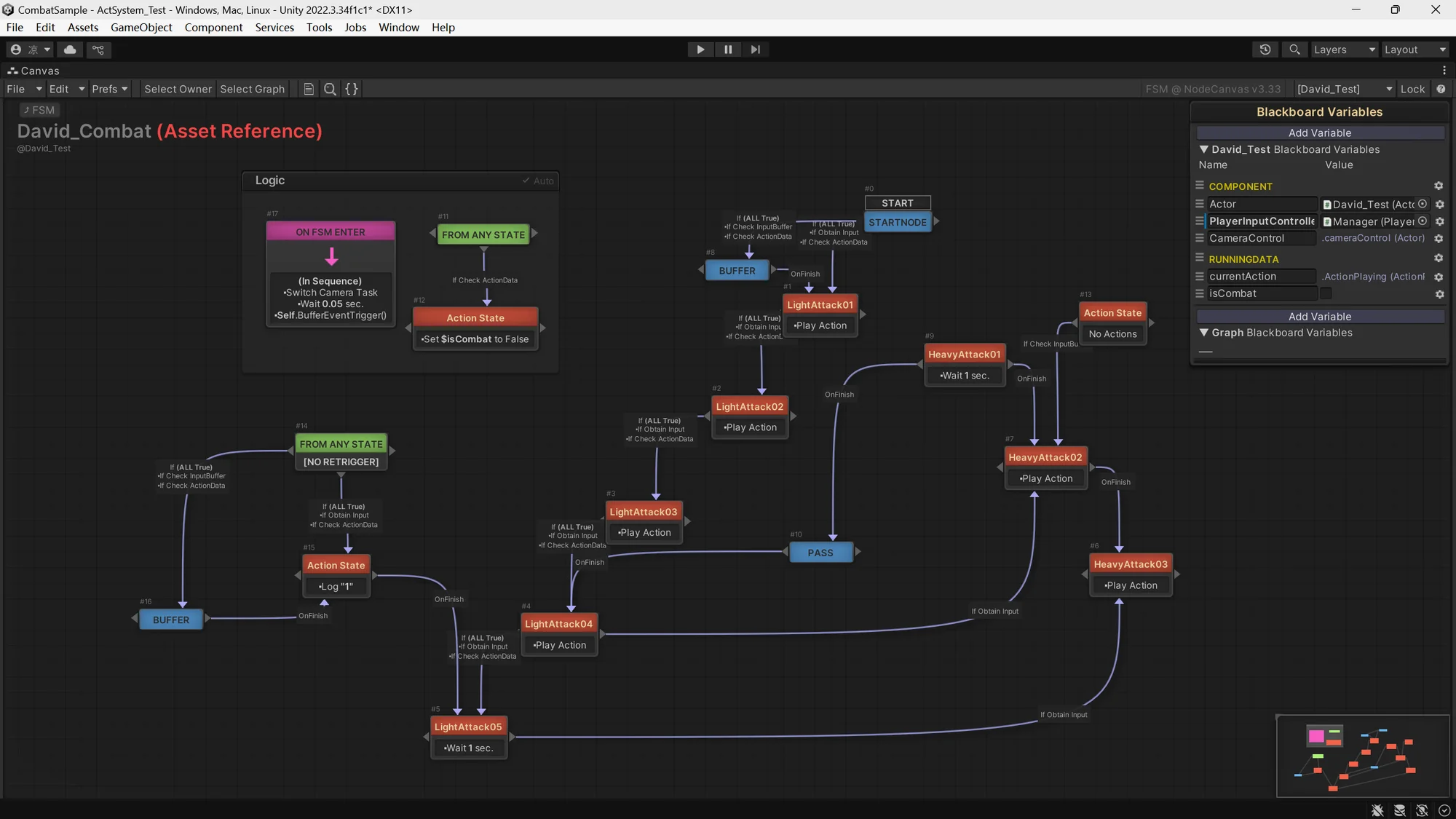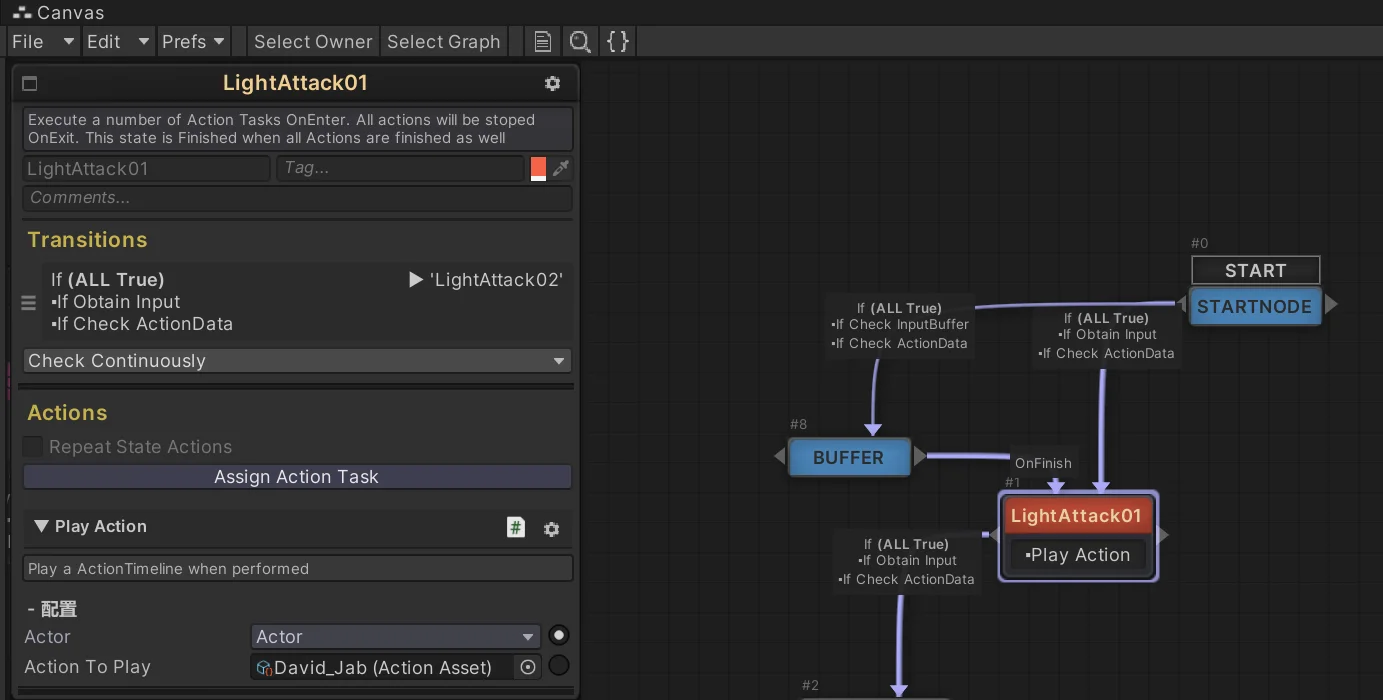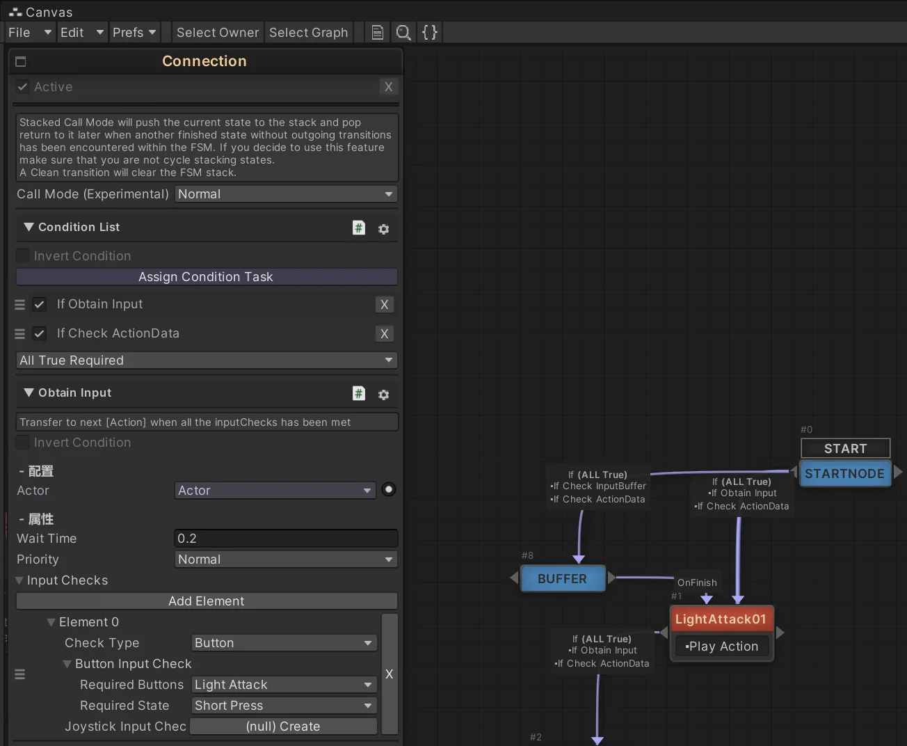 - 為角色創建FSMAsset,系統創建播放動作、接收輸入等自定義節點,配置動作